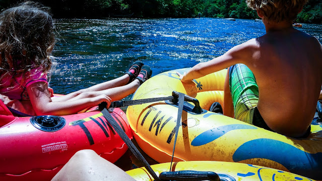 The cabin we were staying at was less than a mile from this tubing site.  We went here our last day to go tubing and this area of the Toccoa is amazing, the rapids were a bit rougher....but it made the trip a whole lot of fun.  It was gorgeous with all the trees that surrounded the river in this area.  Maggie made a friend on the river, her name was Georgia.  They were too cute trying to hold onto each others tube as we drifted down river with the current.